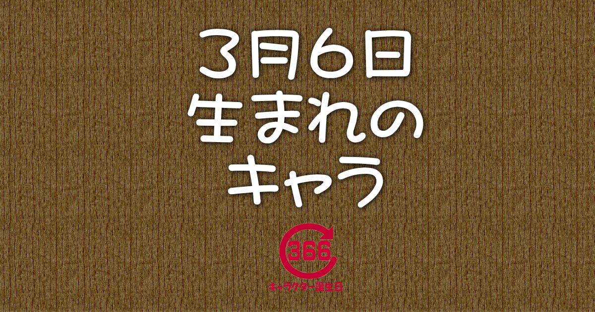 3月6日の誕生日情報 誕生日 2024.03.06 『3月6日』が誕生日の キャラクターは157名です。 お誕生日おめでとう #世界一周記念日 #弟の日 #36の日 #スポーツ新聞の日 3月6日 生まれのキャラクター誕生日情報3月6日生まれのキャラクターや星座、血液型、身長等を見ることが出来るサイトです。
