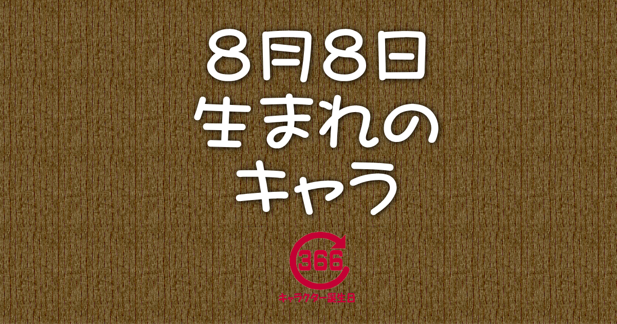 8月8日の誕生日情報 誕生日 2024.08.08 『8月8日』が誕生日の キャラクターは524名です。 お誕生日おめでとう #そろばんの日 #ひげの日 #フジテレビの日 #チャーハンの日 #エプロンの日 #屋根の日 #二輪自転車安全日 8月8日 生まれのキャラクター誕生日情報8月8日生まれのキャラクターや星座、血液型、身長等を見ることが出来るサイトです。